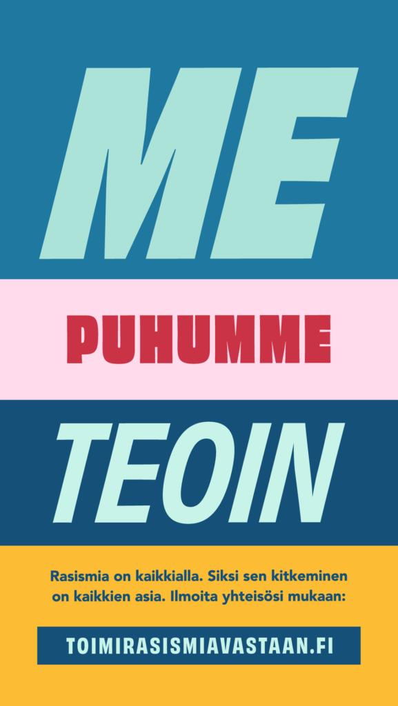 Sosiaalisessa mediassa kampanjan yhteydessä käytetään tunnistetta #toimirasismiavastaan. Julkaisuissa voi halutessaan mainita tai merkitä valtioneuvoston kanslian sekä Motiva Oy:n.
